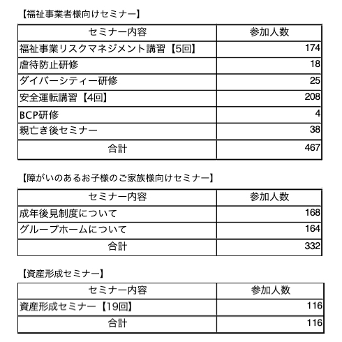 ・当社はお客様の“あんしん”に向けた情報提供の場として、「福祉事業者様向けセミナー」、「障がいのあるお子様のご家族様向けセミナー」、「資産形成セミナー」などの様々なセミナーを開催しています。