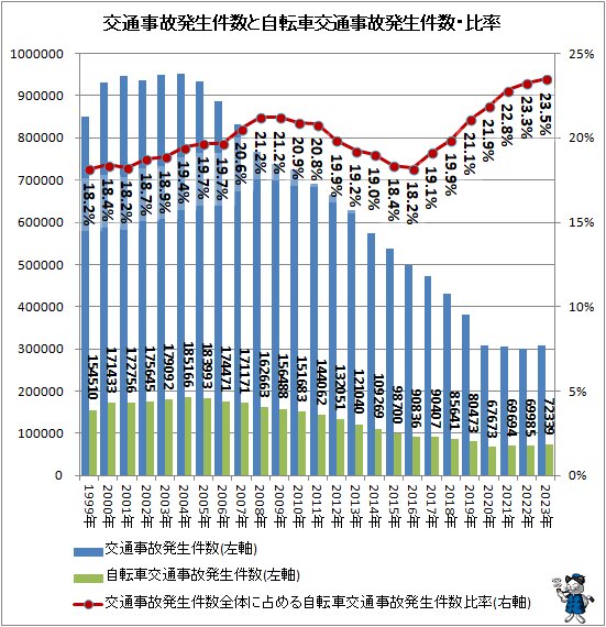 警察庁によりますと、全国の交通事故の発生件数は毎年減少している一方で、自転車交通事故は2020年から3年連続で増加、全体に占める比率は2016年から上がり続けています。