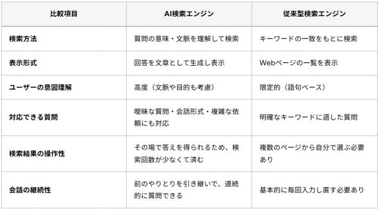 AI検索エンジンと従来型検索エンジンの違いについて、よくまとまっているものがありました。